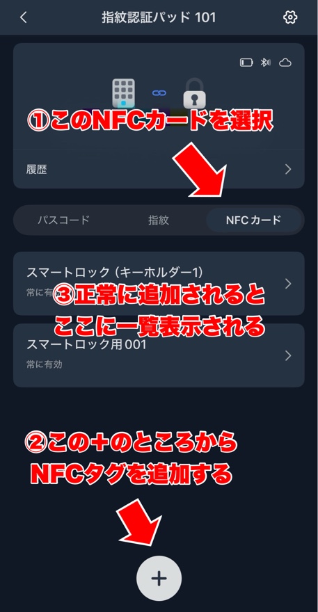 SwitchBotのアプリから、指紋認証パッドを選んで、【NFCカード】を選択。