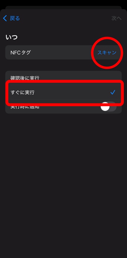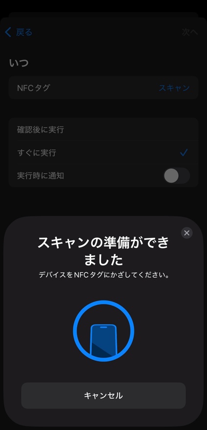【すぐに実行】を選択したら、そのまま、NFCタグのスキャンに進む。