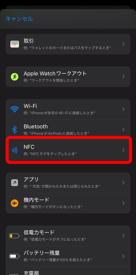 このショートカットアプリで、その声のトリガーをNFCにします!というように設定するんです。