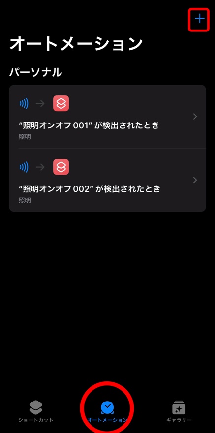 下の【オートメーション】を選んで、右上の【+】をタップします。