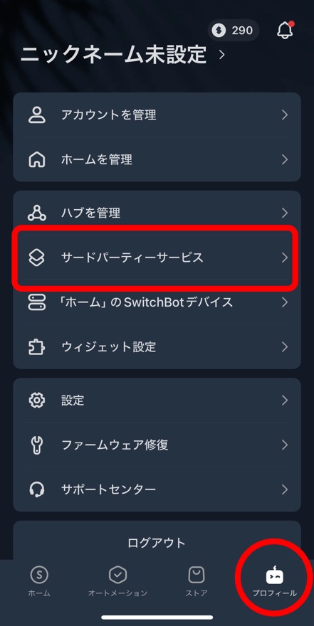 まずはSwitchBotのアプリを立ち上げて、右下の【プロフィール】からこの画面に進んで、、、