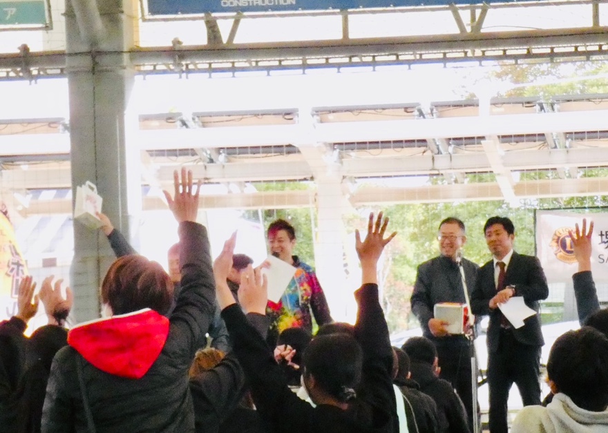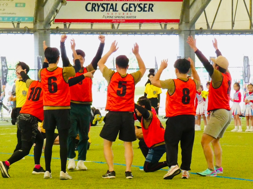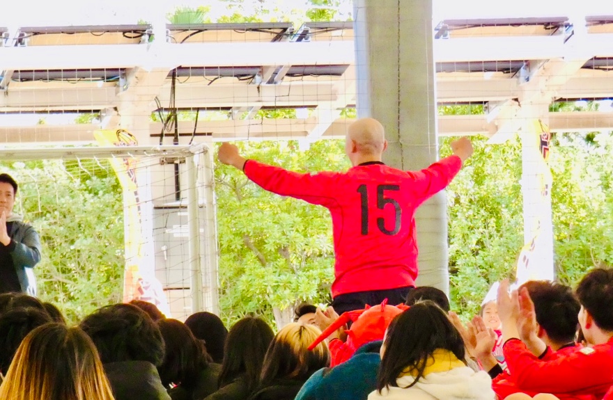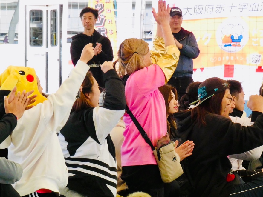 『スタンドM 堺東』のハドルは、応援団も含めて、コートイン!