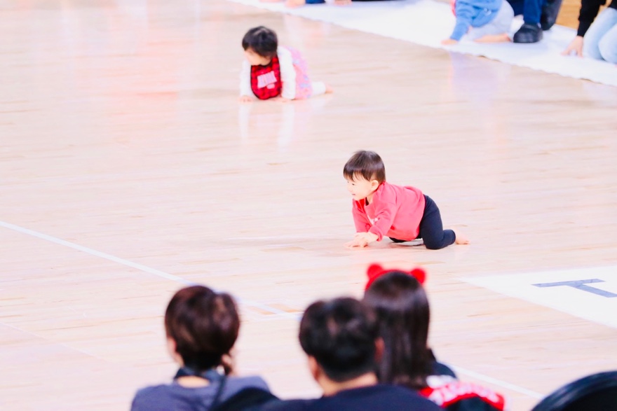 スタートからゴールまでの8mを韋駄天赤ちゃんがハイハイで進みます。