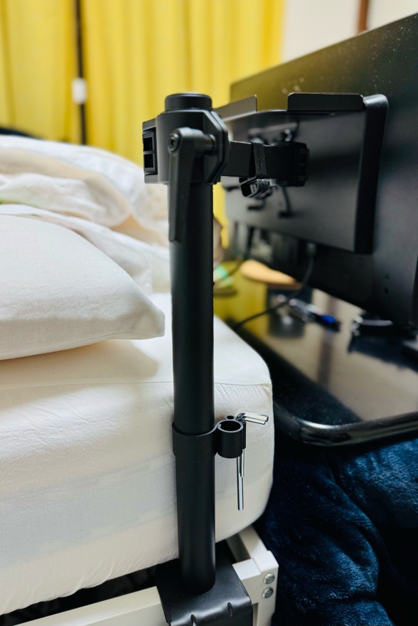 ベットのフレームに、モニターアームを取り付けて、浮かせています。