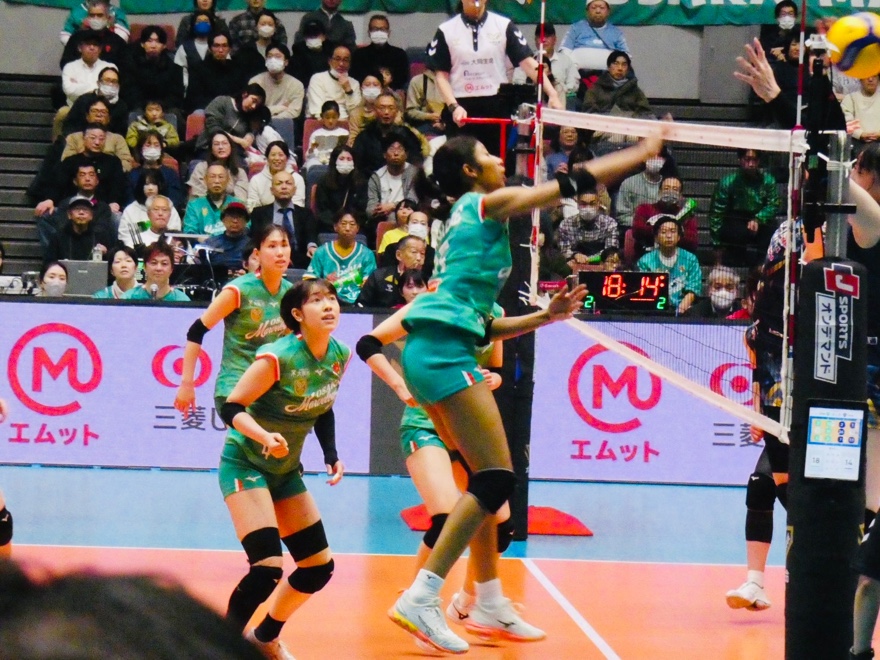 ここまで攻撃のバリエーションを組み立てているセッターの塩出選手、そして、#12 東選手!